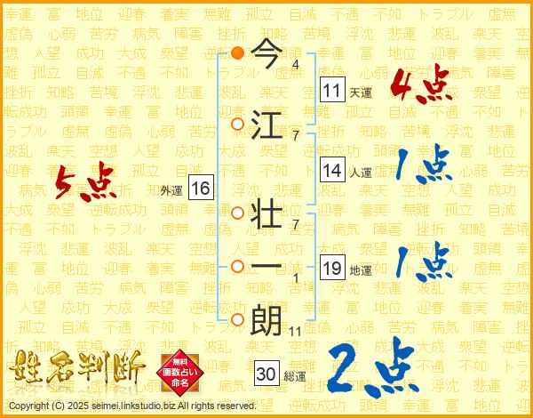 今(4画)江(7画) 壮(7画)一(1画)朗(11画)