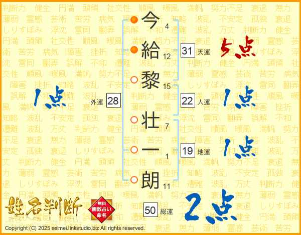 今(4画)給(12画)黎(15画) 壮(7画)一(1画)朗(11画)