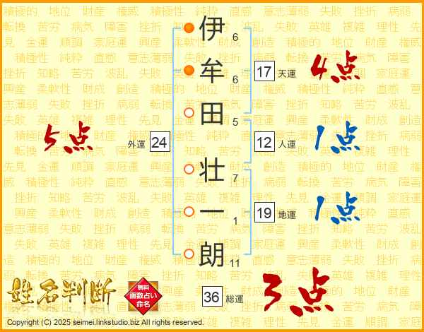 伊(6画)牟(6画)田(5画) 壮(7画)一(1画)朗(11画)