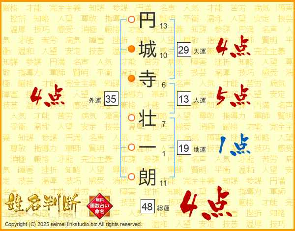 円(13画)城(10画)寺(6画) 壮(7画)一(1画)朗(11画)