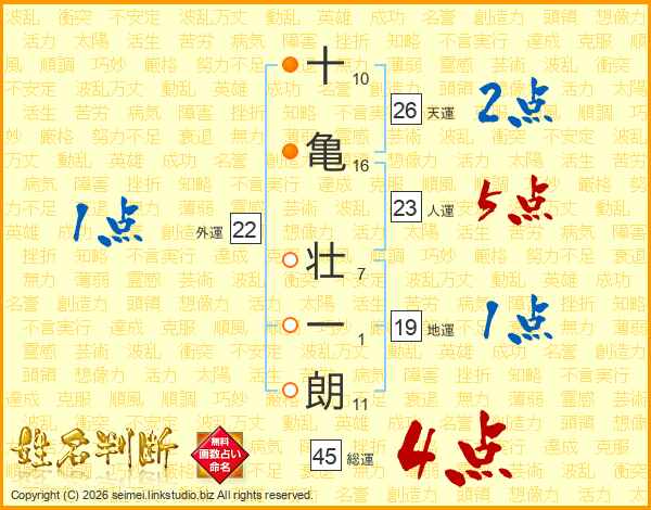 十(10画)亀(16画) 壮(7画)一(1画)朗(11画)