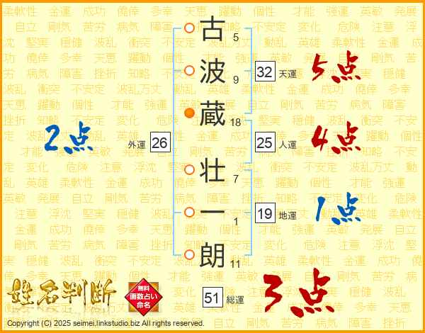 古(5画)波(9画)蔵(18画) 壮(7画)一(1画)朗(11画)