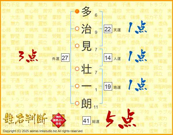 多(6画)治(9画)見(7画) 壮(7画)一(1画)朗(11画)