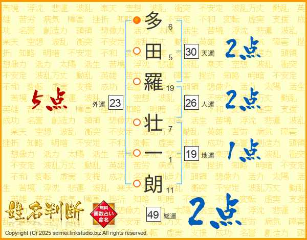 多(6画)田(5画)羅(19画) 壮(7画)一(1画)朗(11画)