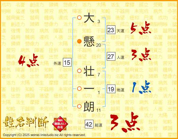 大(3画)懸(20画) 壮(7画)一(1画)朗(11画)