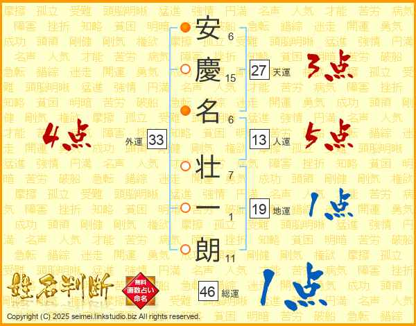 安(6画)慶(15画)名(6画) 壮(7画)一(1画)朗(11画)