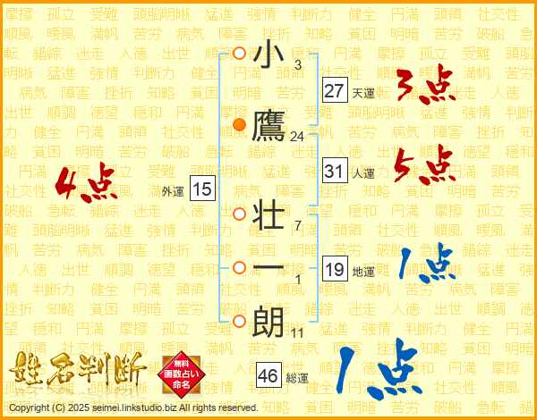 小(3画)鷹(24画) 壮(7画)一(1画)朗(11画)