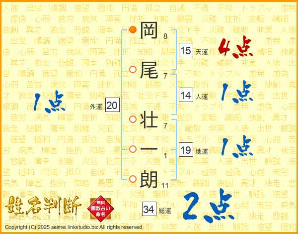 岡(8画)尾(7画) 壮(7画)一(1画)朗(11画)
