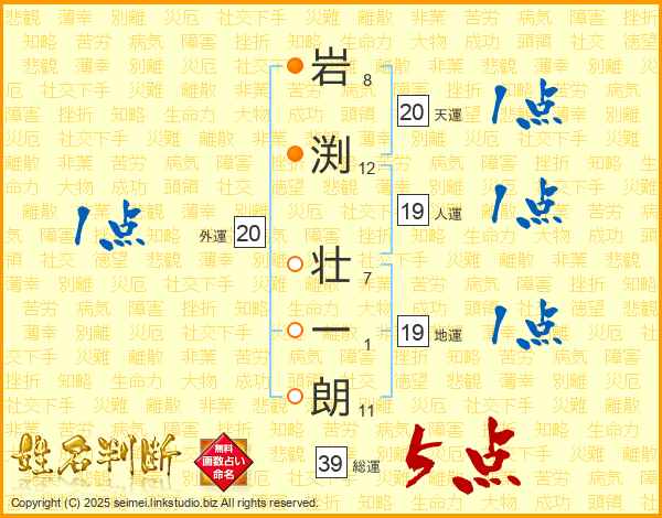 岩(8画)渕(12画) 壮(7画)一(1画)朗(11画)