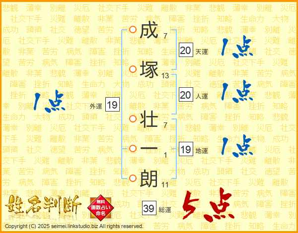 成(7画)塚(13画) 壮(7画)一(1画)朗(11画)