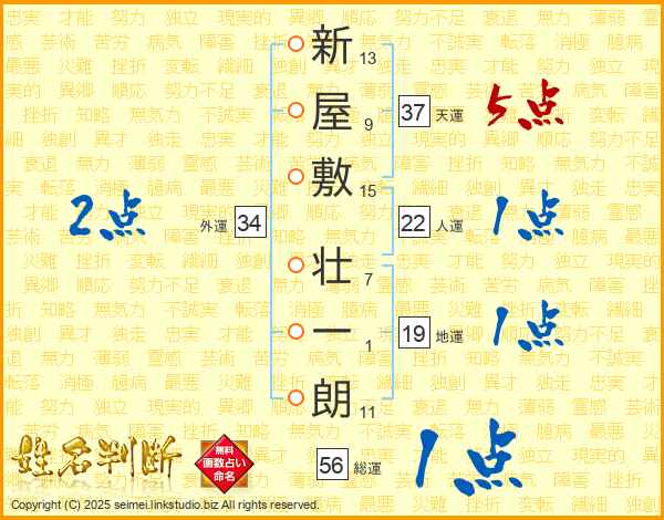 新(13画)屋(9画)敷(15画) 壮(7画)一(1画)朗(11画)
