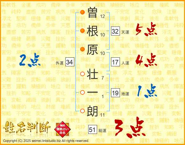 曽(12画)根(10画)原(10画) 壮(7画)一(1画)朗(11画)