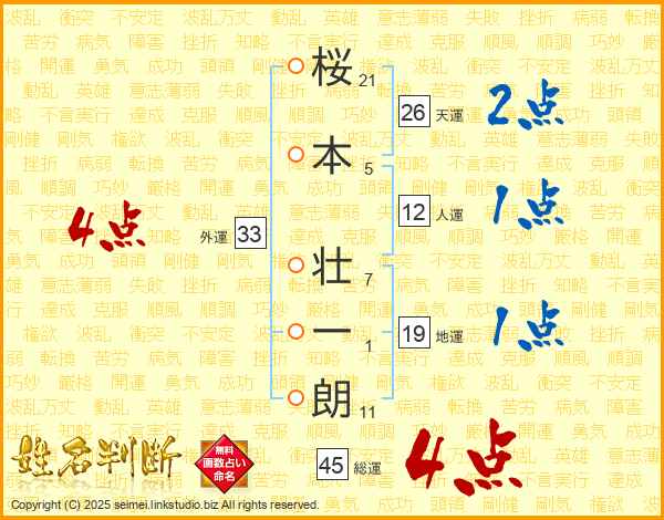 桜(21画)本(5画) 壮(7画)一(1画)朗(11画)