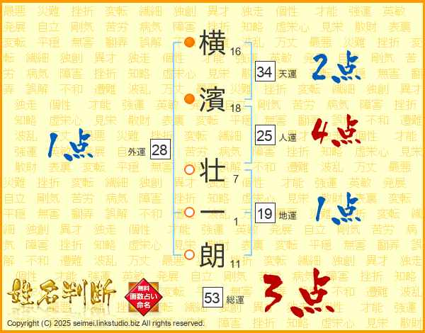 横(16画)濱(18画) 壮(7画)一(1画)朗(11画)