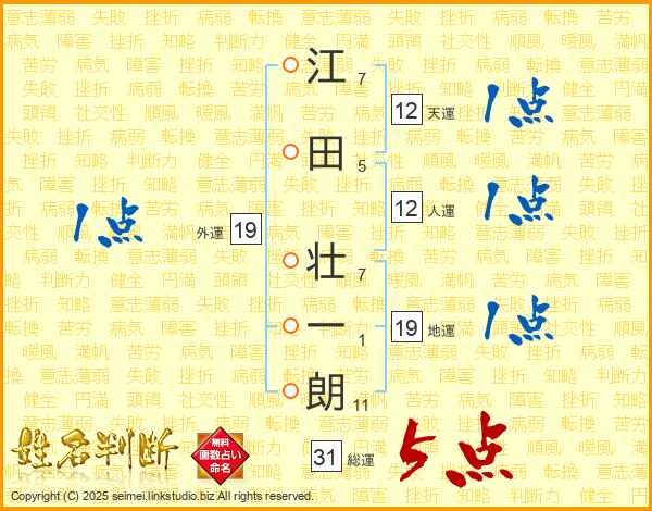 江(7画)田(5画) 壮(7画)一(1画)朗(11画)