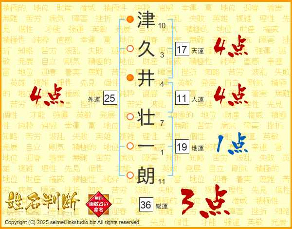 津(10画)久(3画)井(4画) 壮(7画)一(1画)朗(11画)