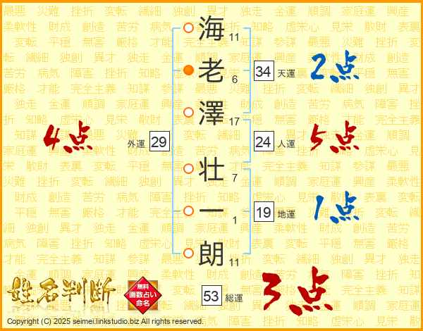海(11画)老(6画)澤(17画) 壮(7画)一(1画)朗(11画)