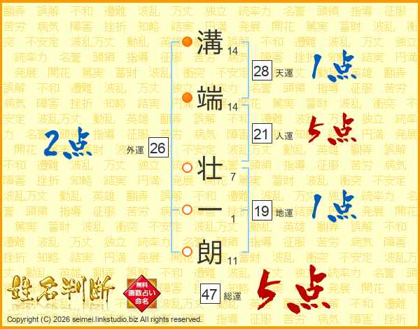 溝(14画)端(14画) 壮(7画)一(1画)朗(11画)