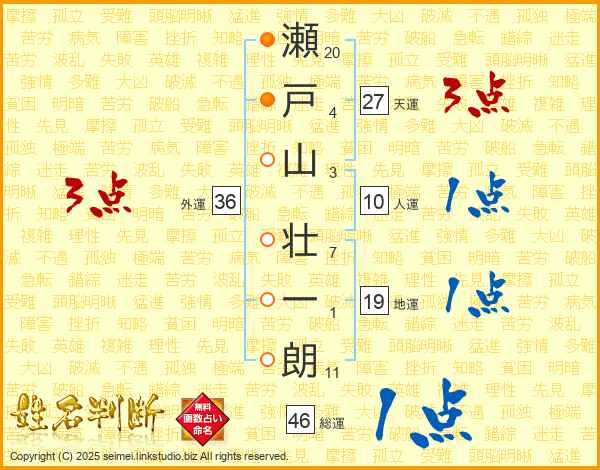 瀬(20画)戸(4画)山(3画) 壮(7画)一(1画)朗(11画)