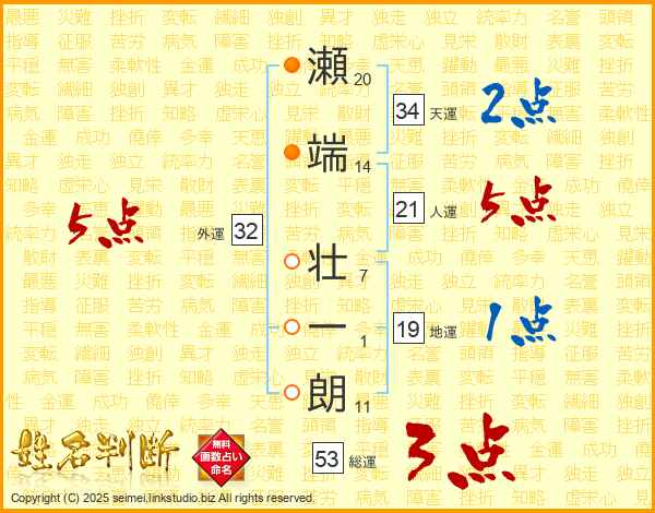 瀬(20画)端(14画) 壮(7画)一(1画)朗(11画)