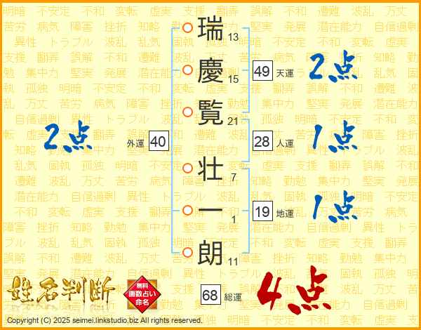 瑞(13画)慶(15画)覧(21画) 壮(7画)一(1画)朗(11画)