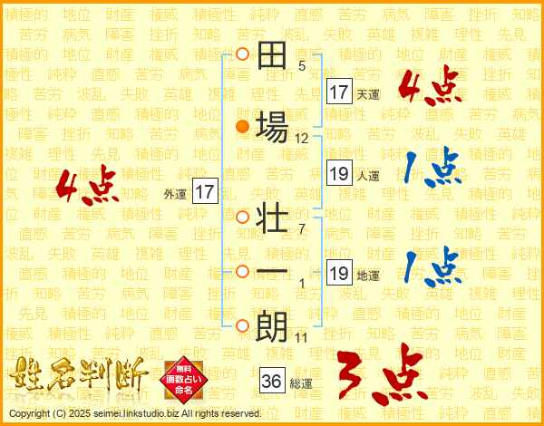 田(5画)場(12画) 壮(7画)一(1画)朗(11画)