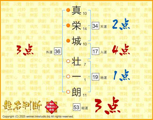 真(10画)栄(14画)城(10画) 壮(7画)一(1画)朗(11画)