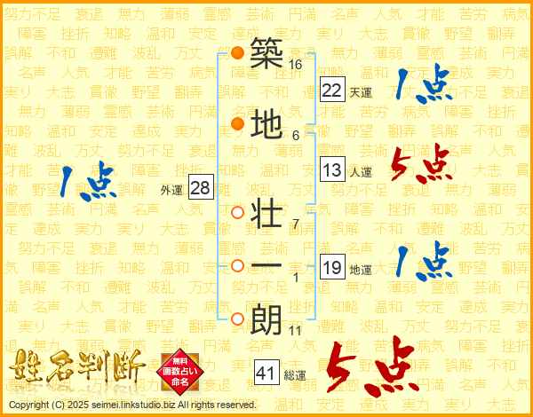 築(16画)地(6画) 壮(7画)一(1画)朗(11画)