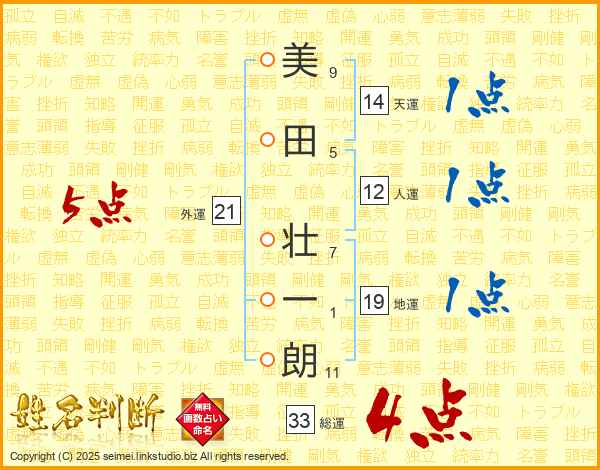 美(9画)田(5画) 壮(7画)一(1画)朗(11画)