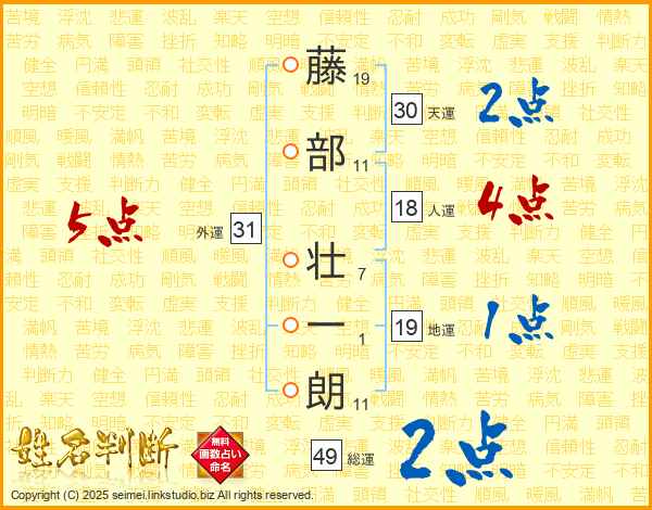 藤(19画)部(11画) 壮(7画)一(1画)朗(11画)