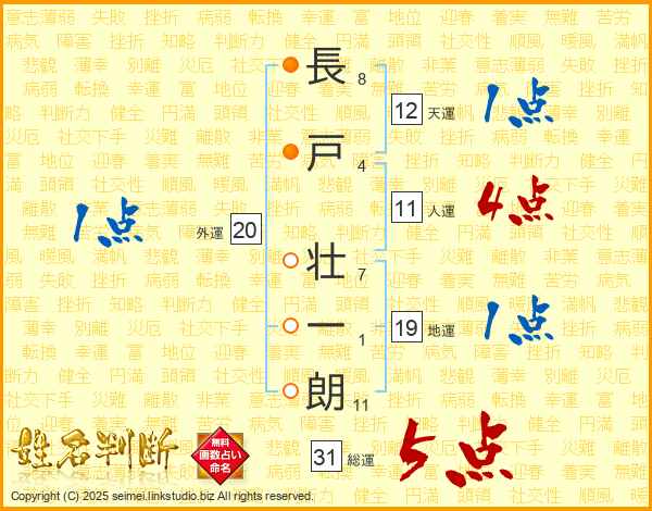 長(8画)戸(4画) 壮(7画)一(1画)朗(11画)