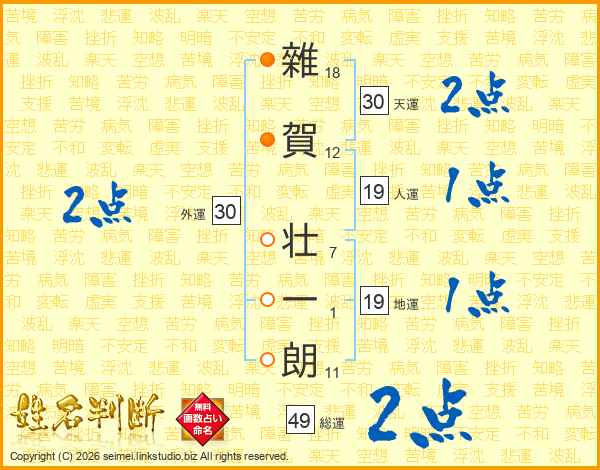 雜(18画)賀(12画) 壮(7画)一(1画)朗(11画)