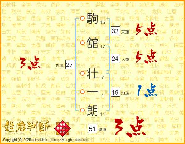 駒(15画)舘(17画) 壮(7画)一(1画)朗(11画)