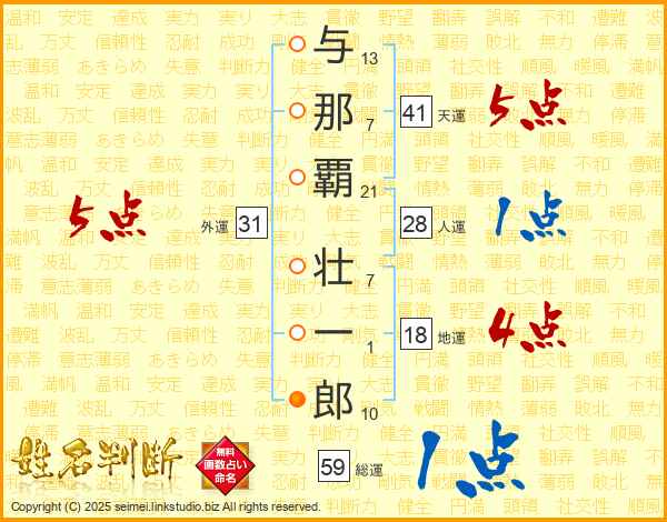 与(13画)那(7画)覇(21画) 壮(7画)一(1画)郎(10画)