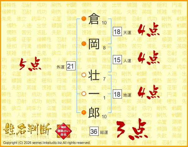 倉(10画)岡(8画) 壮(7画)一(1画)郎(10画)