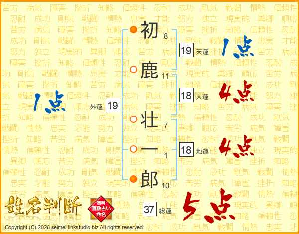 初(8画)鹿(11画) 壮(7画)一(1画)郎(10画)