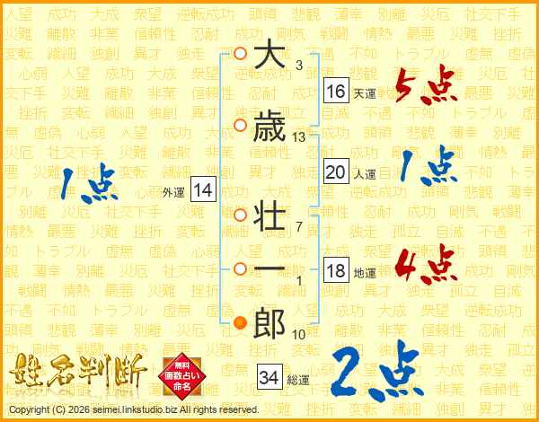 大(3画)歳(13画) 壮(7画)一(1画)郎(10画)