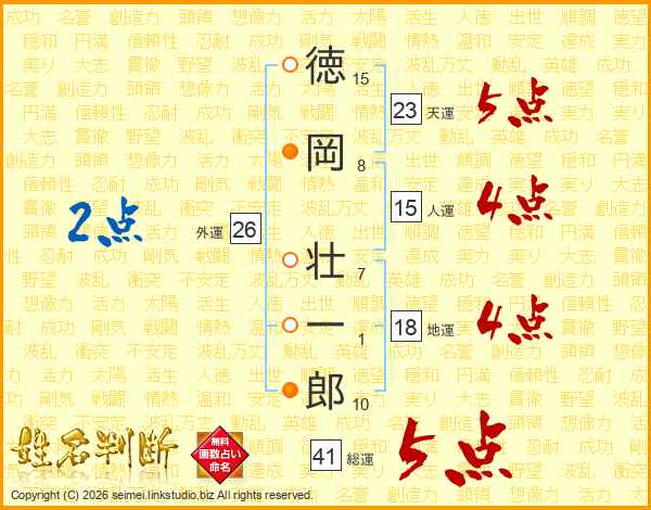 徳(15画)岡(8画) 壮(7画)一(1画)郎(10画)