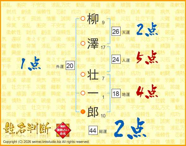 柳(9画)澤(17画) 壮(7画)一(1画)郎(10画)