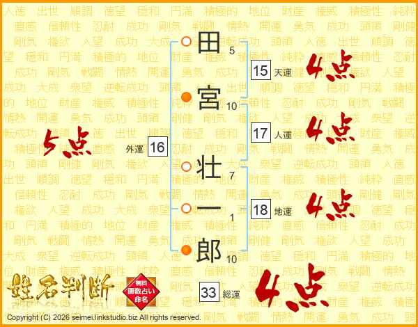 田(5画)宮(10画) 壮(7画)一(1画)郎(10画)