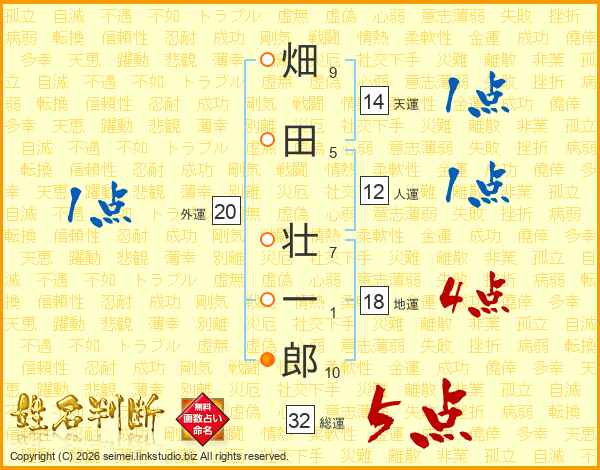 畑(9画)田(5画) 壮(7画)一(1画)郎(10画)