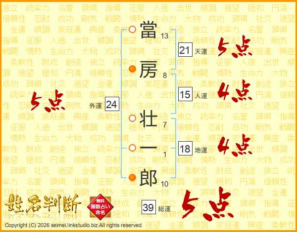 當(13画)房(8画) 壮(7画)一(1画)郎(10画)