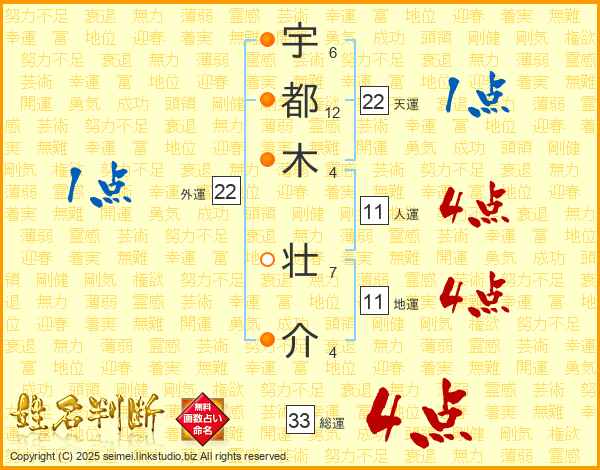 宇(6画)都(12画)木(4画) 壮(7画)介(4画)
