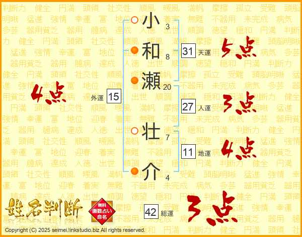 小(3画)和(8画)瀬(20画) 壮(7画)介(4画)