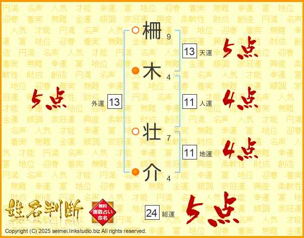 あなたの人生を表す1番重要な運勢です。生涯を通じて影響する総合運となり、主に50歳以降の晩年期に影響を及ぼします。苗字と名前の合計画数。