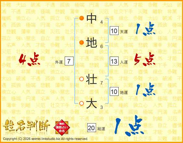 生活面を象徴する運勢です。外部から受ける影響力を表し、結婚運、家庭運や職場、環境への順応性を表します。総運から人運を引いた画数。姓や名が1文字の場合を除く。