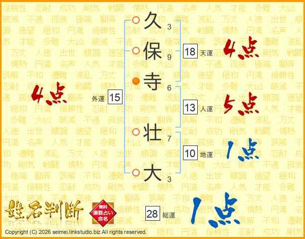 久(3画)保(9画)寺(6画) 壮(7画)大(3画)