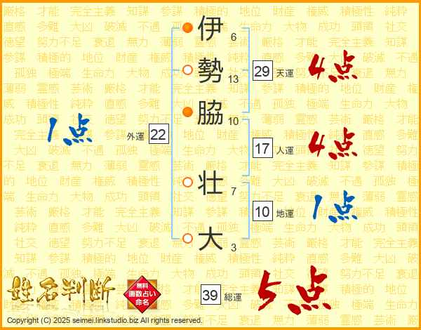 伊(6画)勢(13画)脇(10画) 壮(7画)大(3画)