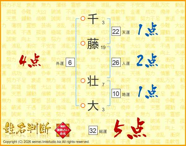 生活面を象徴する運勢です。外部から受ける影響力を表し、結婚運、家庭運や職場、環境への順応性を表します。総運から人運を引いた画数。姓や名が1文字の場合を除く。