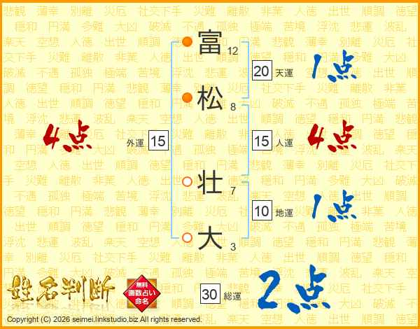 生活面を象徴する運勢です。外部から受ける影響力を表し、結婚運、家庭運や職場、環境への順応性を表します。総運から人運を引いた画数。姓や名が1文字の場合を除く。